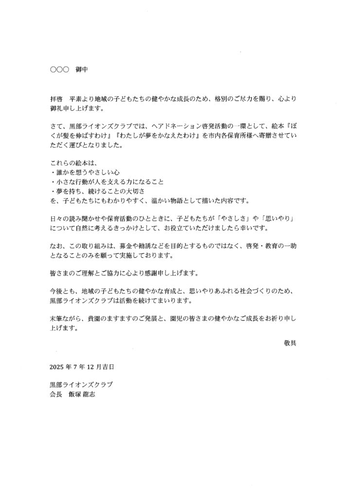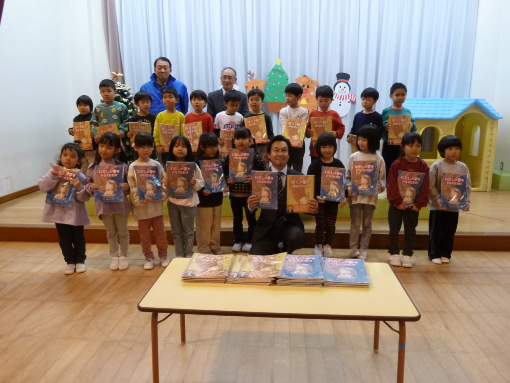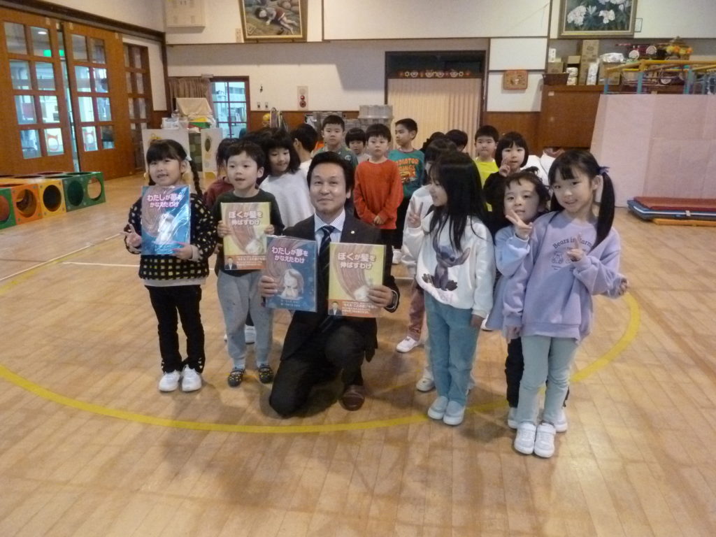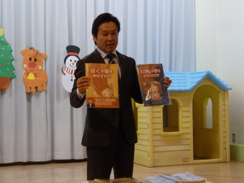 ヘアドネーション啓蒙活動の第3弾!! 絵本『ぼくが髪を伸ばすわけ』『わたしが夢をかなえたわけ』の各2冊(計4冊)を贈呈させていただきました。代表施設として、黒部市荻生保育所に訪問させていただき、22名の園児のみなさんの前で贈呈式をさせていただきました。